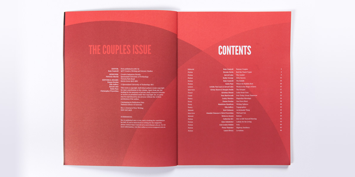 Rex 2011: The Couples Issue. Design, photography and production of QUT's Creative Writing Department 2012 anthology. The publication is designed to raise the awareness of graduating students.
